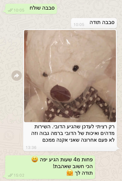 ✨ עיצוב וגימור ברמה גבוהה: אנחנו לא מתפשרים על הפרטים הקטנים. התפרים חזקים ועמידים, הפפיון יושב בצורה מושלמת, והפרופורציות של הדובי מדויקות – הוא נראה מעולה מכל זווית בסלון או בחדר השינה.